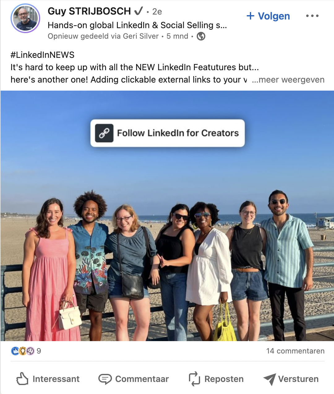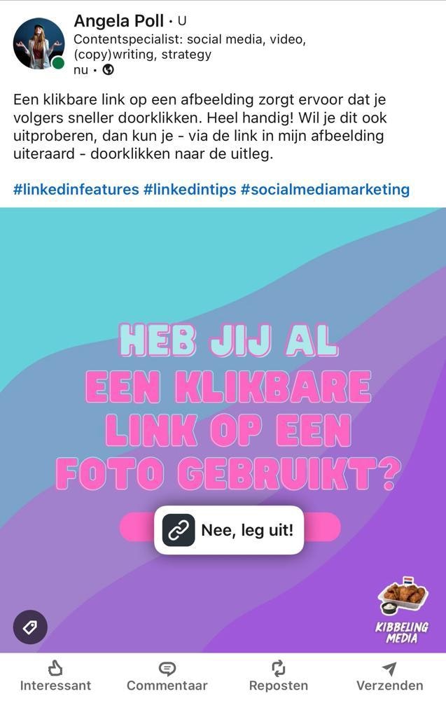 Soms wil je een bericht op social media plaatsen waarbij je niet wilt dat mensen de tekst in de post lezen, maar vooral doorklikken op een link. En op LinkedIn kon je voorheen alleen een link in de tekst plaatsen. Maar gelukkig is die frustrerende tijd voorbij: LinkedIn heeft de nieuwe functie toegevoegd waarbij je een link op een afbeelding kunt plaatsen, en die kun je in de feed delen. Lekker voor je CTR! Hieronder zie je een voorbeeld, en daaronder de uitleg. Probeer het uit!