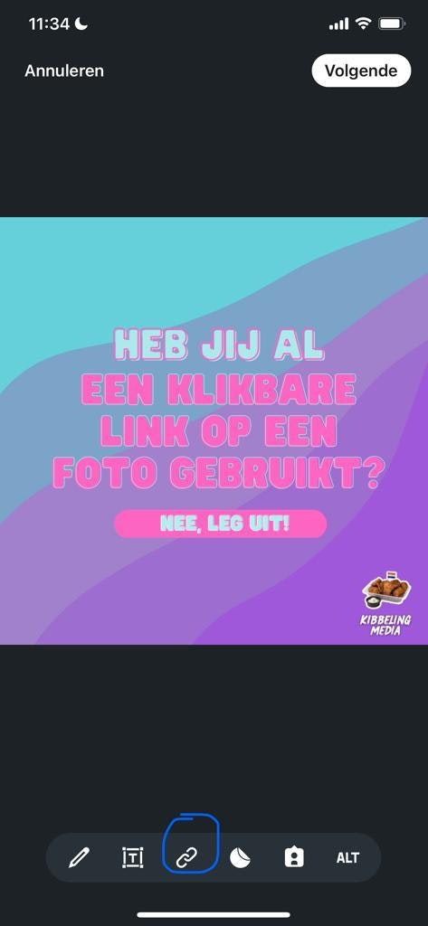 Je kunt de sticker nog verplaatsen, vergroten, verkleinen en draaien. Je kunt ook 'stickers' toevoegen, zoals pijltjes die naar de link wijzen. De knop voor de sticker zie je op bovenstaand screenshot rechts naast het link-knopje. Dat rondje waar dan net iemand het bovenste randje van omgevouwen heeft. Wat je niet kunt aanpassen, is het design van de link. Dat is dan weer jammer.